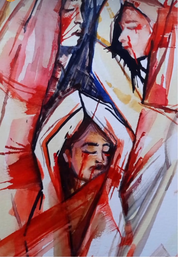 Bild: Frans Al-Salmi, “Der Tod des Märtyrers. Blut aromatisiert mit Kardamon.” Quelle: https://www.theartnewspaper.com/2025/07/01/two-artists-killed-in-israeli-air-strike-on-gaza-cafe