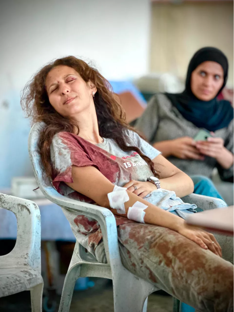 Bild: Verwundete Frau nach dem israelischen Angriff auf das Al-Baqa-Café am 30. Juni 2025. Quelle: https://orain.eus/eu/aktualitatea/mundua/2025/06/30/israelgo-eraso-batek-33-pertsona-hil-zituen-gutxienez-tartean-kazetari-bat-gaza-hiriko-hondartzaren-ondoan/