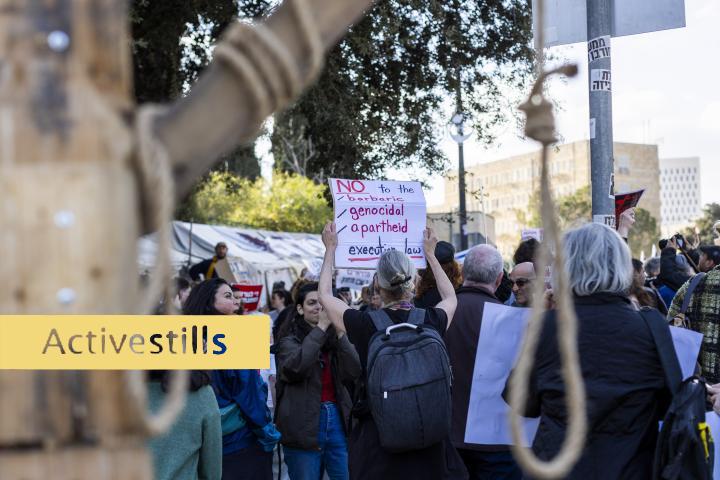 Bild: Jerusalem, 31. März 2026. AktivistInnen protestieren vor der Knesset gegen das neue Gesetz, das die Todesstrafe ausschließlich für PalästinenserInnen vorsieht. (Activestills: Avishay Mohar)